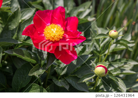 Blooming red peony in the garden