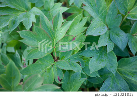 生薬である「立てば芍薬」の葉っぱ。品種はバードゼラ、花言葉は「恥じらい」「はにかみ」。