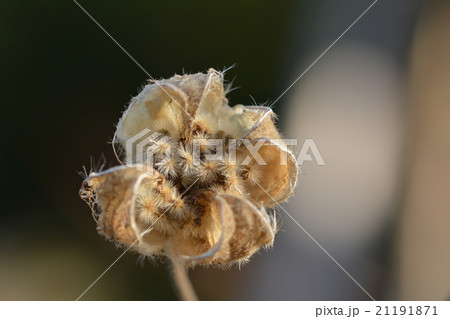 フヨウの果実が熟すと五裂して多数の種子を出す 逆光冬の光景