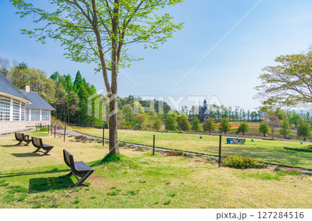北海道の初夏 白樺林と新緑の芝 メモスペース 多め