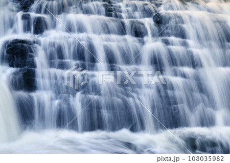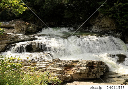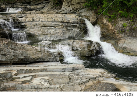 北海道芦別市芦別 芦別川の階段状の砂岩層を流れ落ちる名勝三段滝のスローシャッター撮影