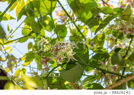 花が咲いた郁子(ムベ)のつると葉/アケビ科・4月
