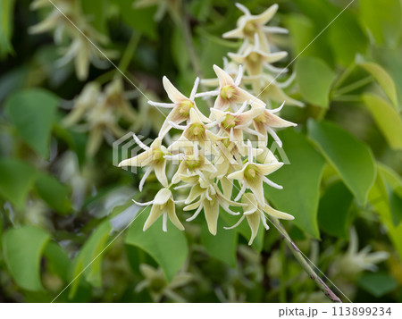 自然 植物 ムベ、花です。春から初夏にかけて葉腋に総状花序を出し数個の花をつけます