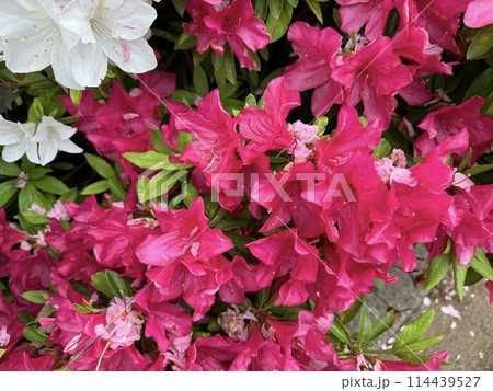 ツヅジ・サツキ(と思われる)の花の上に、八重桜の花がら/The flowers