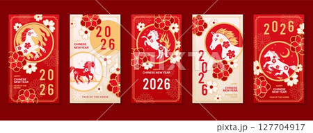 Chinese horse new year cards. Traditional asian horoscope symbol, red flowers patterned animal silhouettes, fiery steed, celebration 2026, zodiac posters, flyer template, tidy vector set