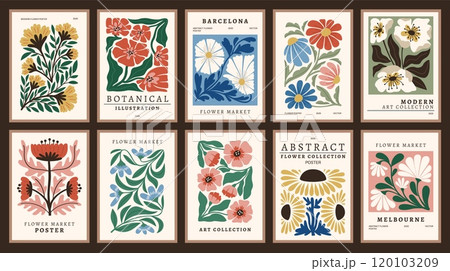 Modern flowers posters. Abstract floral cover templates collection, trendy botanical elements, plants contemporary compositions, Matisse art, flower market, wallpaper or print, tidy vector set