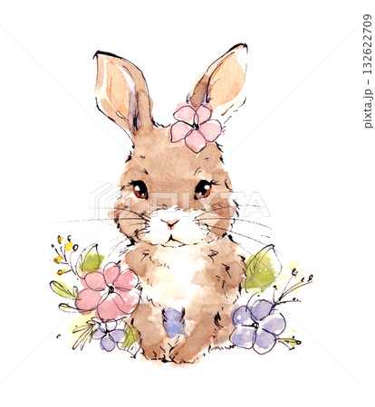 春の花に囲まれた可愛いウサギの水彩イラスト