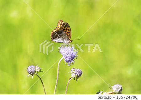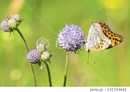 Close-up of vibrant silver-washed Fritillary butterfly (Argynnis paphia) with orange wings and green/silver underside perched on purple meadow devil's-bit scabious (Succisa pratensis) flower.