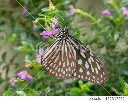 白黒模様の蝶が花にとまる自然の風景