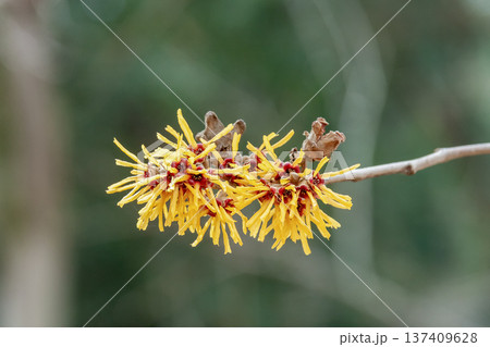 枯れ葉が花の時期に残るシナマンサク【マンサク科】