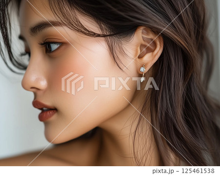 日本人女性の横顔と花型イヤリングのクローズアップ ジュエリー・美容系広告向け