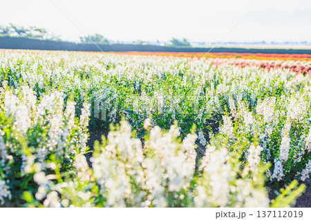 北海道・ファーム富田の花畑 朝の光に輝く色とりどりの花のライン