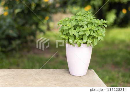 Close-up of Hydrangea plant in pot and granular fertilizer, outdoor in garden, top view