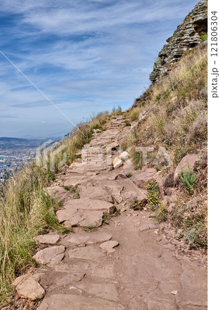 Trail on Table Mountain with vibrant, beautiful nature along a path. Trees and lush green bushes growing in harmony. Peaceful soothing fresh air with stunning views of natural landscape
