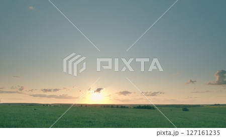 A Serene and Peaceful Sunset Casting Its Glow Over a Vast Green Landscape of Tranquility