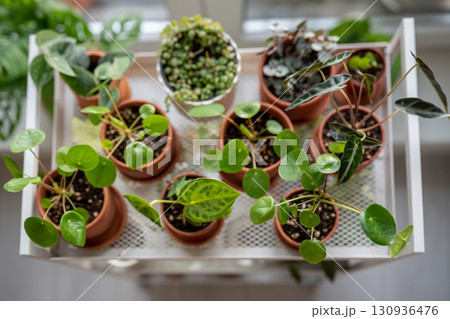 Sprouts plants in terracotta pots on cart at home. Houseplant after replanting into new flowerpot