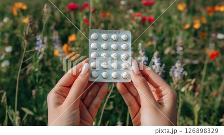 Female hands holding blister pack of pills in spring meadow with colorful flowers