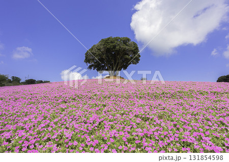 マザー牧場の丘に広がるペチュニアの花畑と青空