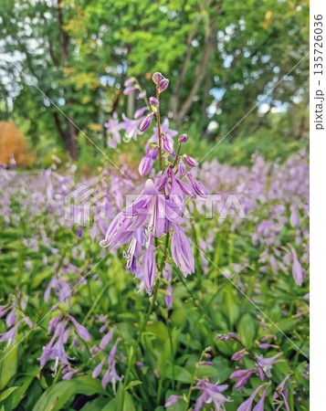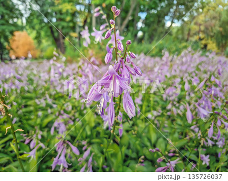 Close-up shot of a dense bed of Hosta plants in bloom. Lush green leaves and tall stalks bearing delicate, trumpet shaped lilac flowers