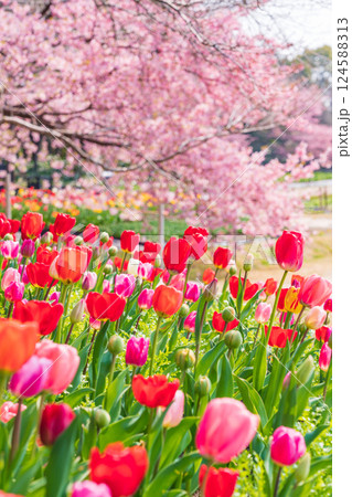 春のなばなの里、満開のチューリップと河津桜〈三重県桑名市〉