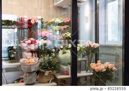 Flower shop with huge arrenge of flowers and lovely roses, floristics concept