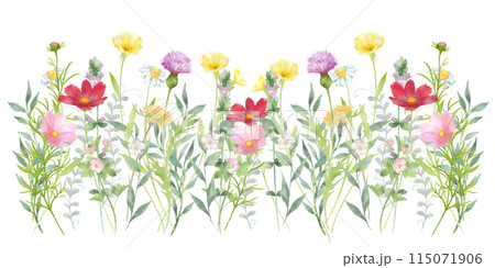 いろいろな花の花畑の水彩画