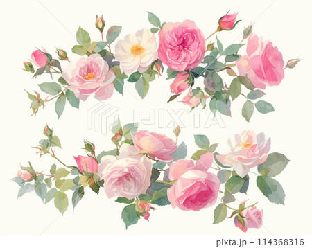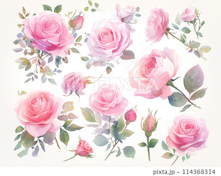 White roses with green leaves in collection garden flowers. Watercolor illustration for wedding floral design of bouquets, wreaths, arrangements, wedding invitations, anniversary, birthday, postcards