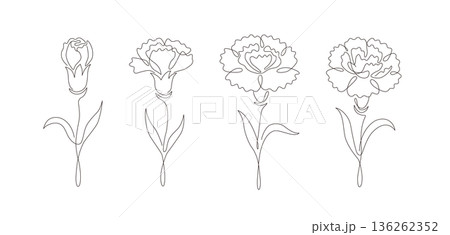カーネーションの一筆書き線画イラストセット 蕾から満開まで 線幅変更可能なベクター素材