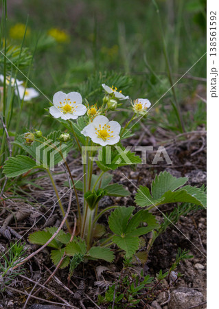 Creamy strawberry with white flowers and trifoliate leaves thriving in natural habitat during spring season