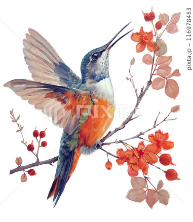 Hummingbird bird drinks juice from flowering plant with vitamins on print. Watercolor artwork