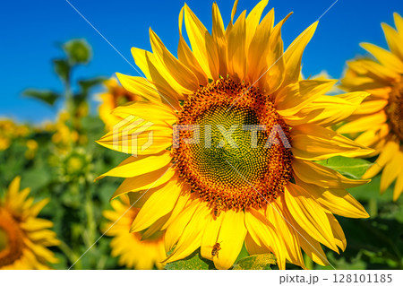 Blooming sunflower against blue sky, close-up of flower and bees pollinating sunflower, concept of farming and growing organic crops for oil production and livestock feed