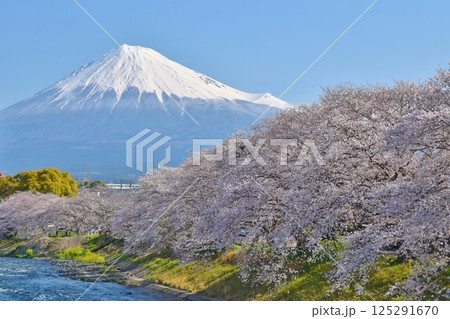 富士市の龍巌淵の桜並木と富士山