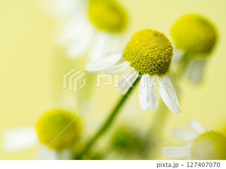 Fresh chamomile flowers gathered for a medicinal tea, overhead flat lay