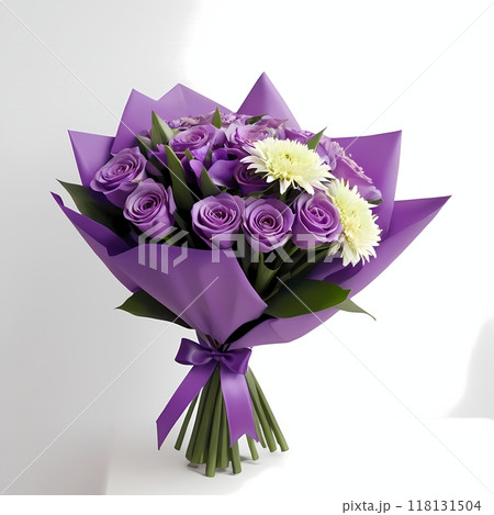 AIで生成した紫のリボンとカラフルなバラのブーケ
