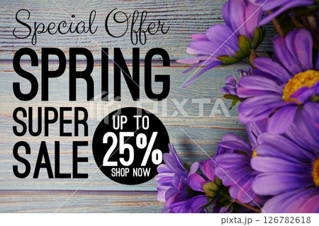 Spring Sale 25% Promotion and Marketing with flowers bouquet decoration on wooden background