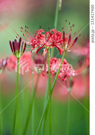 競い合う花たち 蕾と花が並び立つ彼岸花の共演