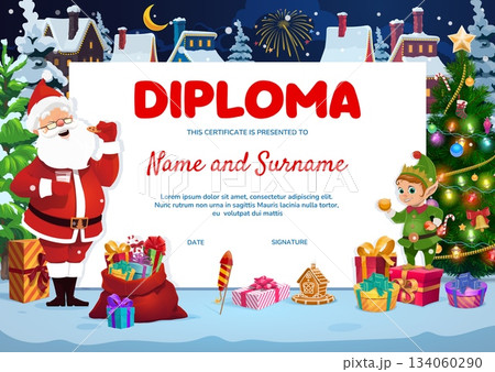 Christmas and New Year holidays kids diploma certificate with Santa drinking milk and eating cookie while elf holds orange. Vector certificate with gift boxes, decorated tree, and fireworks