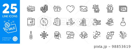 Outline icons set. Leadership, Teamwork process and Builder warning icons. Champagne, Heart, Warning web elements. Phone communication, Survey, Messenger mail signs. Image gallery. Vector