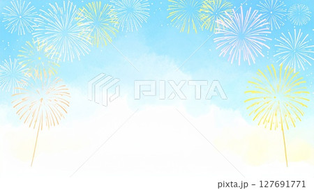 夏の打ち上げ花火のフレーム 水彩手描き風 背景素材 16:9サイズ AI生成素材