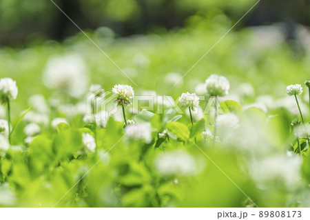 シロツメクサ クローバー ボケ 新緑の季節(2022年 初夏 大阪城-西の丸庭園)