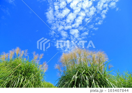 爽やかな秋の景色 秋晴れの空に映えるパンパスグラス