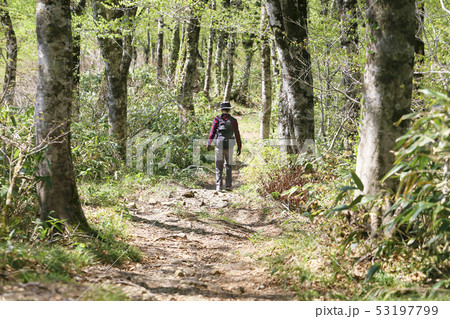 ブナ林の登山道を歩く女性(禿岳)