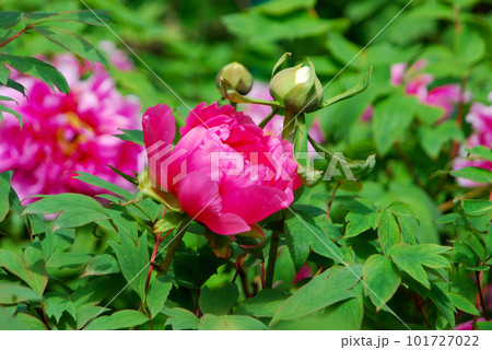 牡丹園に牡丹の花が咲いています。このピンク色の牡丹の花の名前は花競(ハナキソイ)です。