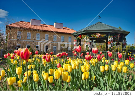 チューリップ花壇からの洋館のながめ