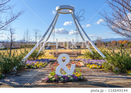 富士山ベンチと冬の花壇(花菜ガーデン/神奈川県平塚市)