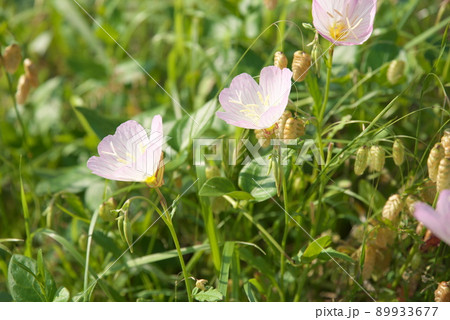 昼咲き月見草(Oenothera speciosa):エノテラ【緑背景】