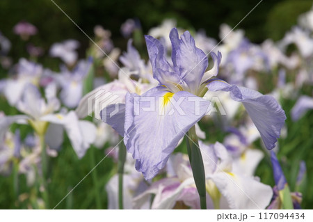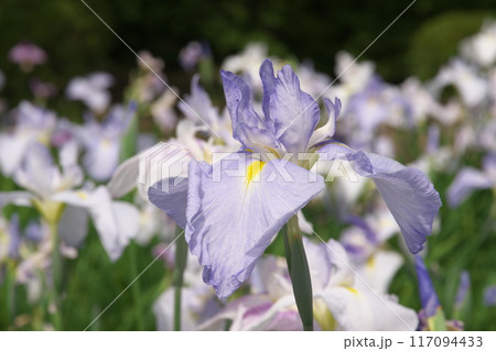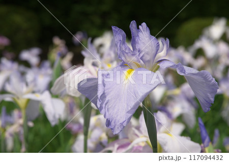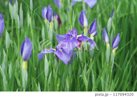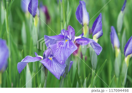 菖蒲園に咲く紫色の花菖蒲【相模原公園:緑背景】