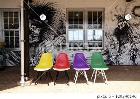 壁に郷土のイラストが描かれた施設に置かれたカラフルな椅子