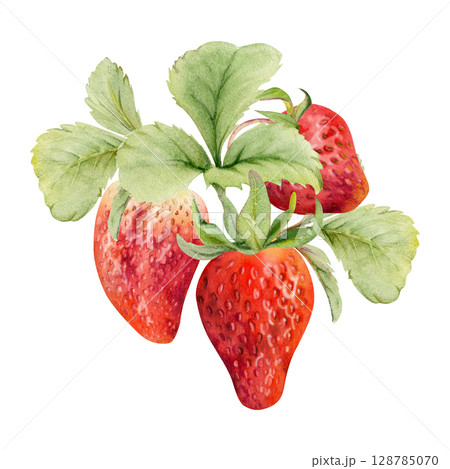 Strawberry berries growing in leaves, ripe garden pineberry strasberry harvest. Isolated botanical watercolor hand drawn illustration. Dessert menu, grocery food packaging, farmers market, cosmetics