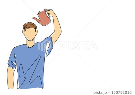 Single one line drawing man watering his head of flowering plants with a watering can. Always keep thinking positive. International Day of Plant Health. Continuous line design graphic illustration